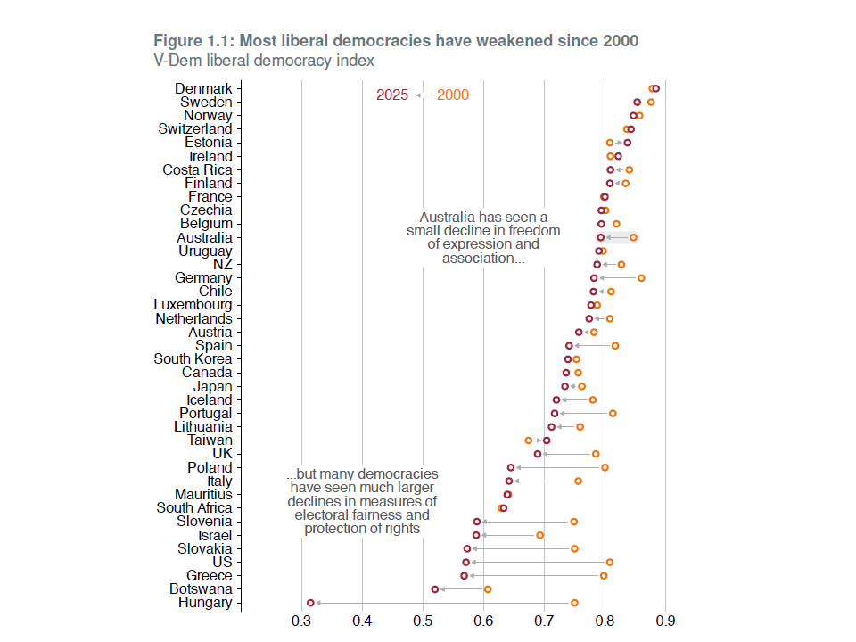 In a recent report (For the People: Future Proofing Australia’s Democracy, April 2026) researchers from the Grattan Institute highlight a decline in democratic standards in Australia over the last 25 years. See Figure 1.1. We rank 12th out of 31 countries that identify as liberal democracies. The authors point out that there are a number of things we can do to improve our position which are summarised here: